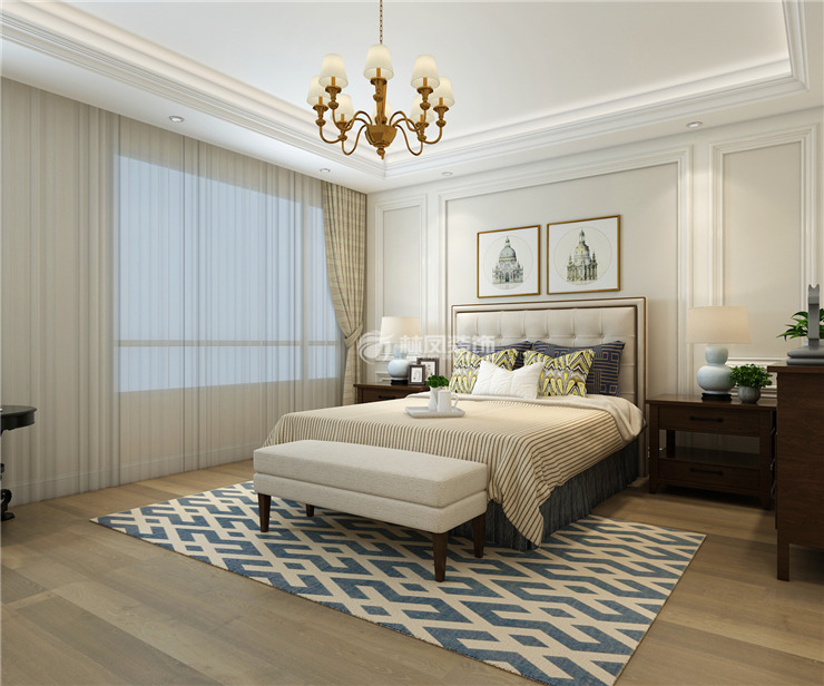 主卧室说明:主卧采用了低饱和度的米白,搭配胡桃木色家具,让空间看起来更加沉稳笃定,蓝黄的枕头点缀了卧房,与蓝色条纹地毯搭配,碰撞出诗意的存在。