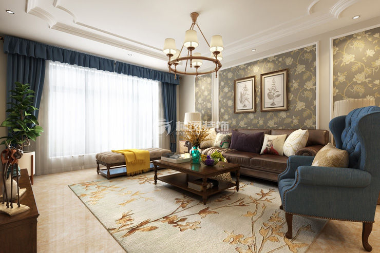 本案的客厅美式纯皮头沙发,搭配质地温馨的仿古地砖以及电视背景墙的护墙板,将美式带入家中,其他吊棚及布局还偏向简约,让业主真正实现轻装修重装饰的完美体验。