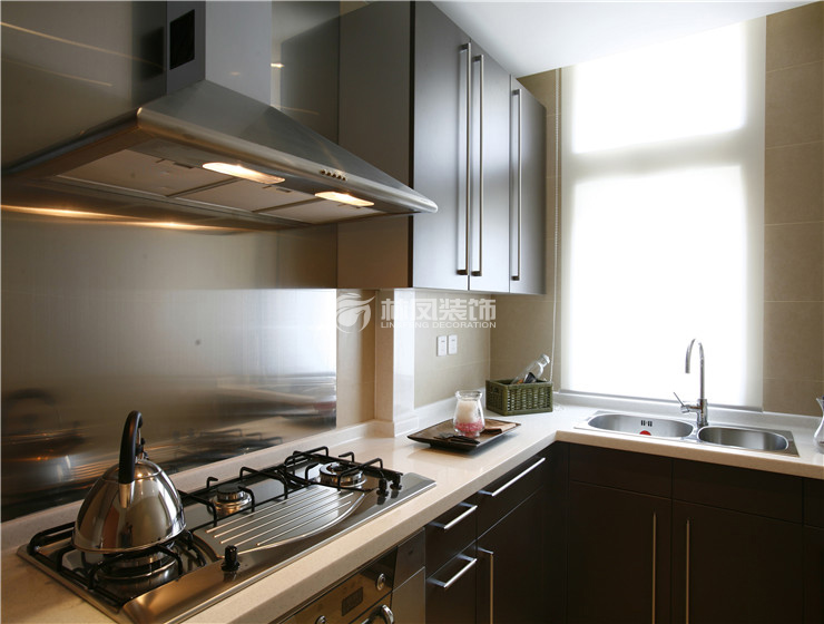厨房空间并不大。所以橱柜的选择只能是L型转角为最佳选择。深咖色烤漆橱柜搭配白色天然石英石橱柜。真题厨房的瓷砖也是偏与暖色。为了和橱柜做成整体冷暖搭配。让厨房的色彩搭配额更加强烈。
