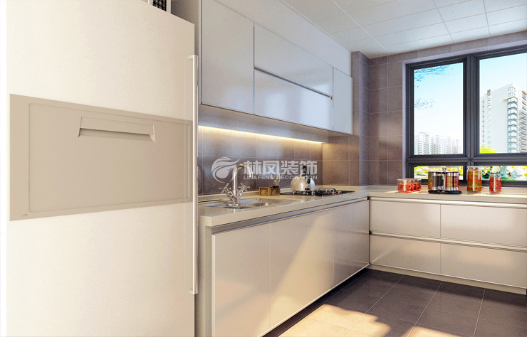 厨房整体灰色瓷砖,配上白色橱柜的厨房是女主人的活动空间,那么在色彩上做出了温馨的感觉,主人的小资生活会更品味舒适。
