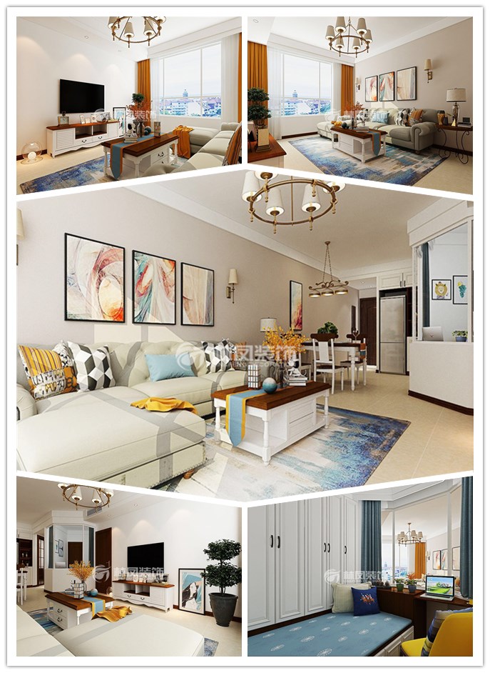 轻美式风格基调定位为简单、素雅,保留了美式的大气自由,搭配了恬静的田园风,色调温暖,避免了缭乱的色彩纷扰,踏进这个空间,有种身心在云端游荡的感觉。淡彩的墙面、天花板、沙发与深色系的家具背景墙相得益彰,赋予空间平衡之美;摒弃一切繁琐和奢华,去零化整的空间规划,没有堆砌的颜色和摆设,没有繁复设计的家具,整个空间看起来,简而不凡。