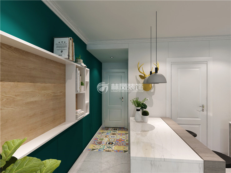 餐厅业主更需要的时尚,因此对于它的设计更多的是将实用性和美观性相结合。餐厅摒弃了传统设计中的餐桌,并用吧台将其替代 ,让人感觉到现代都市的时尚氛围。吧台上的鹿头装饰则是为家中带来经典北欧风格的元素,述说着北欧风格特有的亲你关心自然。后方的餐边柜和墙面的盘子使空间更加饱满,充满生活的气息。