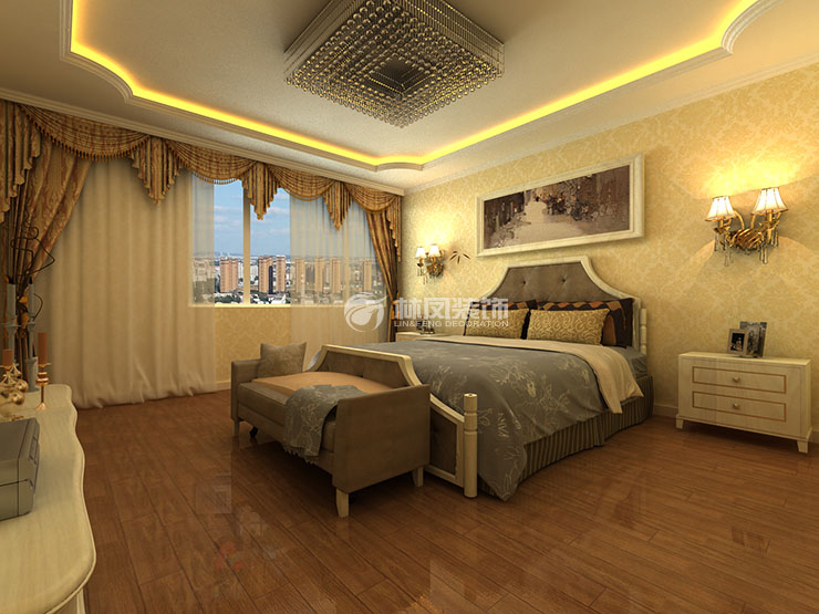 以原木色为卧室主色调营造的空间凸显干净利落,简洁的二级吊顶搭配暖色光源给人一种干净的氛围。结合设计感的吸顶灯让卧室瞬间进入温馨时刻,为业主提供舒适的休息氛围。
