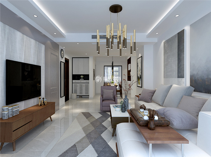 客厅采用现代风格的家具,搭配精致的水晶吊顶和简洁的吊顶营造出一种干净,利落的感觉。木质的加入也让空间再灰色背景下多了温度,也体现出业主对于生活的一种态度。