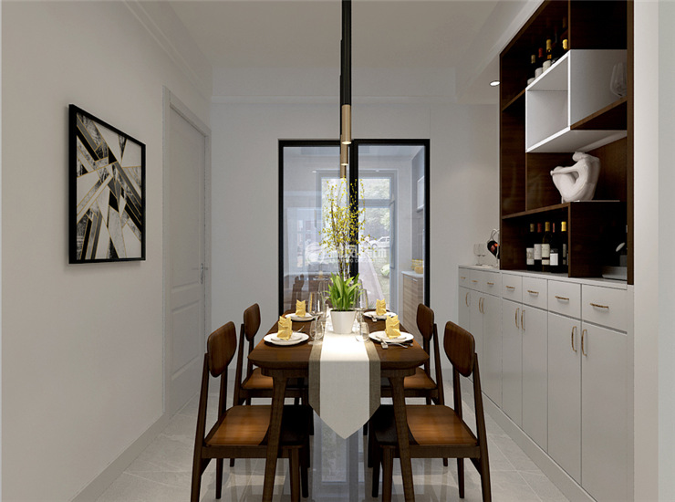 现代餐桌椅,搭配套色的酒柜,干净而不单调与厨房的色调相呼应,厨房与餐厅相对独立也相对联系。
