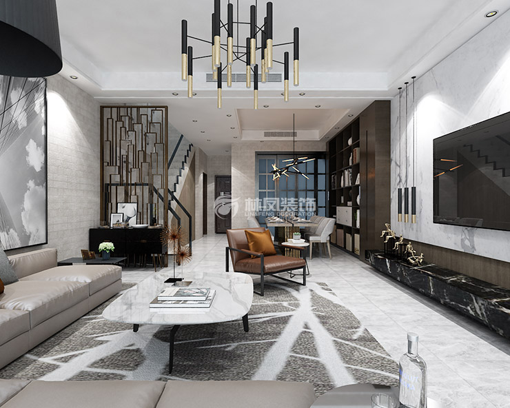 客厅使用皮质沙发,主色调点为灰色,棕色作为点缀。结合现代感的吊灯和大理石电视背景墙使空间充满设计感,玻璃楼梯使空间极其宽敞,配饰搭配使整个空间简洁又不失温馨。