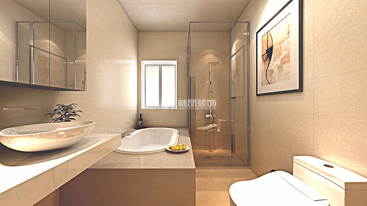卫生间主要以暖色系为主,大理石台面与嵌入式浴缸加上淋浴房 ,功能齐全且美观。