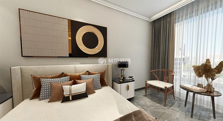 主卧室为暖灰色地砖使空间更加明亮大气,温馨程度提升,墙面运用米色与地板生成鲜明的对比,视觉效果更好。主卧采光效果很好,运用落地窗更显空间宽敞明亮,落地窗旁配有休闲区,其中理石边几更突显主题风格。