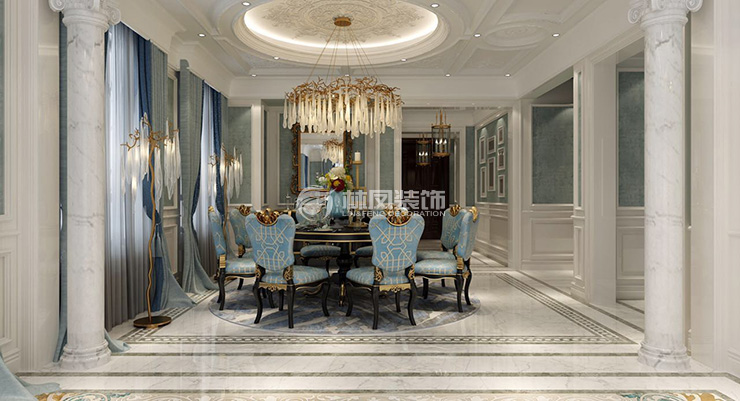 餐厅顶面与客厅的设计手法一致采用石膏花线作为顶面装饰与地面的石材拼花相对应,中间配以欧式古典餐桌形成三点一线使空间的画面感更强。