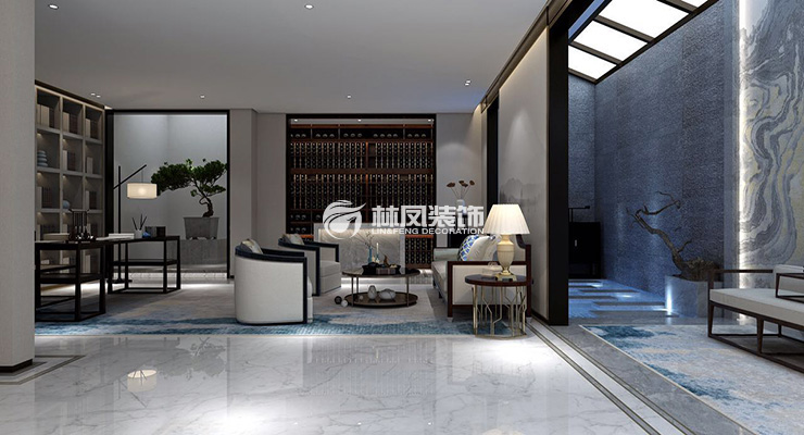 设计理念:楼上为欧式风格元素以采用爵士白的罗马柱和大理石及白色的护墙板为主色基调配以蒂芙尼蓝的家具与窗帘作为点缀营造出一种欧式典雅的空间氛围。楼下则采用中式的设计手法配以水系景观及绿植形成一种独特的室内氛围。