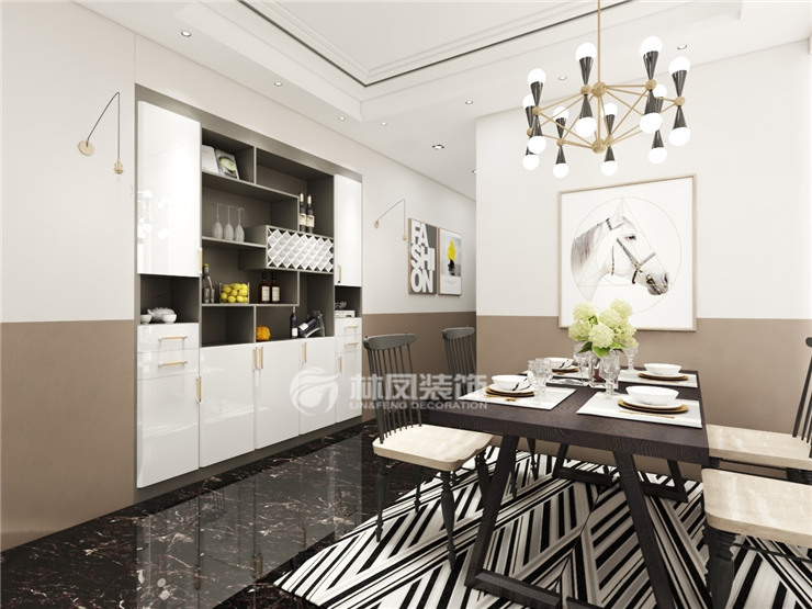 由于整体空间的局限性,餐厅采用LED灯带处理整个餐厅背景,使得空间更具有层次感。黑色的餐椅与同样黑色的餐桌相呼应,体现生活的质感与品质。
