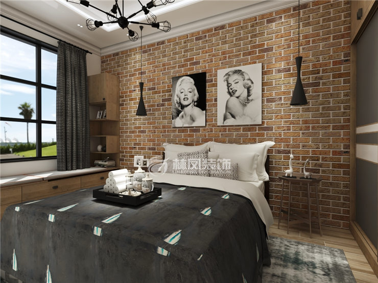 卧室大胆融合工业LOFT元素,展现出强烈的递进层次感,高级灰与实木家具的结合,展现一种低调的奢华。