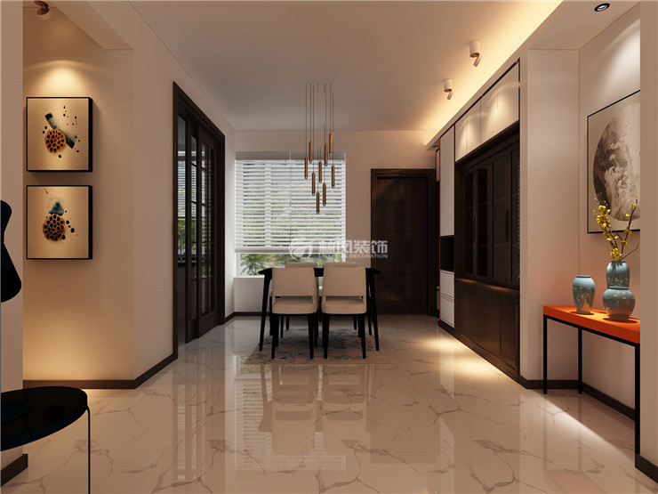 餐厅区域跟玄关区域相连,选用了黑色实木餐桌和白色的餐椅让餐厅的整个空间显的干净简洁,而长凳的摆放,为以后全家聚餐提供座椅的同时,也作为摆放景观出现,玄关作为与餐桌相连之处,除了本身自带酒柜要融到定制柜子中之外,我们还要有不同的设计,为不影响动线的情况下,做了抹斜处理,而这个颜色,就是我们的对比色!平淡之中,处处透着惊喜。