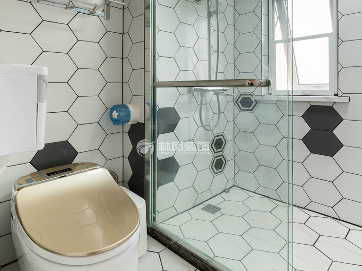 卫生间地面使用百色的瓷砖,墙面使用黑色白色砖来体现地面与墙面的区别以及增加空间的立体感,白色的洗手盆,金属条镶圈的镜子,增加空间视觉效果,使其空间扩大化。