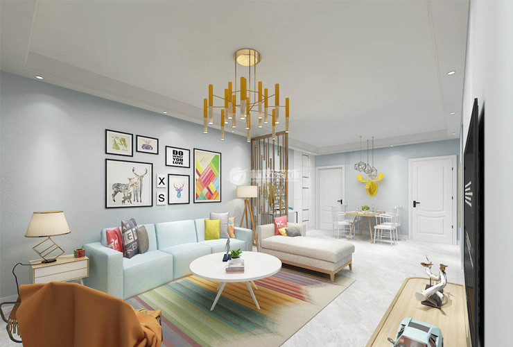 客厅整体墙面以浅蓝色为主,突出整体空间的明快之感。沙发和门口之间做了隔断隔开,更体现空间的层次感。