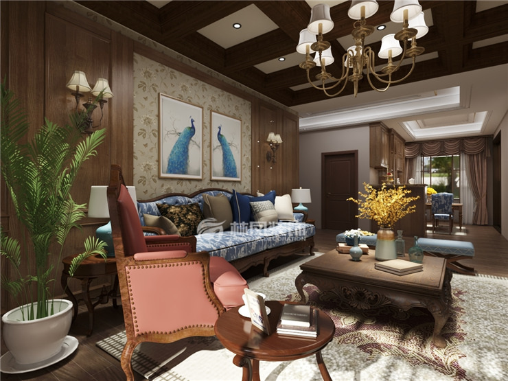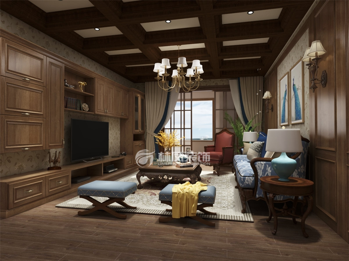 设计理念:大量使用木制墙板烘托美式独有的尊贵和身份,给人一种宽敞而富有历史气息的感觉。稳重的氛围营造使得整个客厅空间更加有层次感将主人低调华贵的性格体现的淋漓尽致
