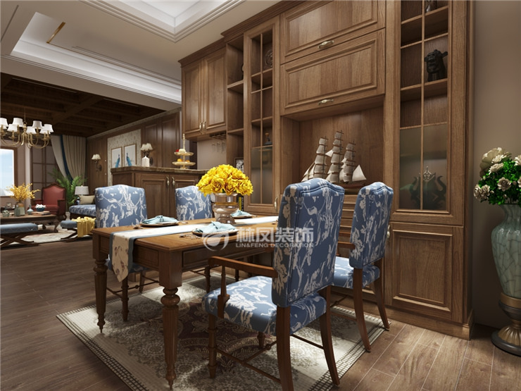 餐厅纯实木的家具组合同样延续整体设计主线。复古的味道持续围绕整个设计空间。让人无处不感觉到美式所带来的奢华感觉。