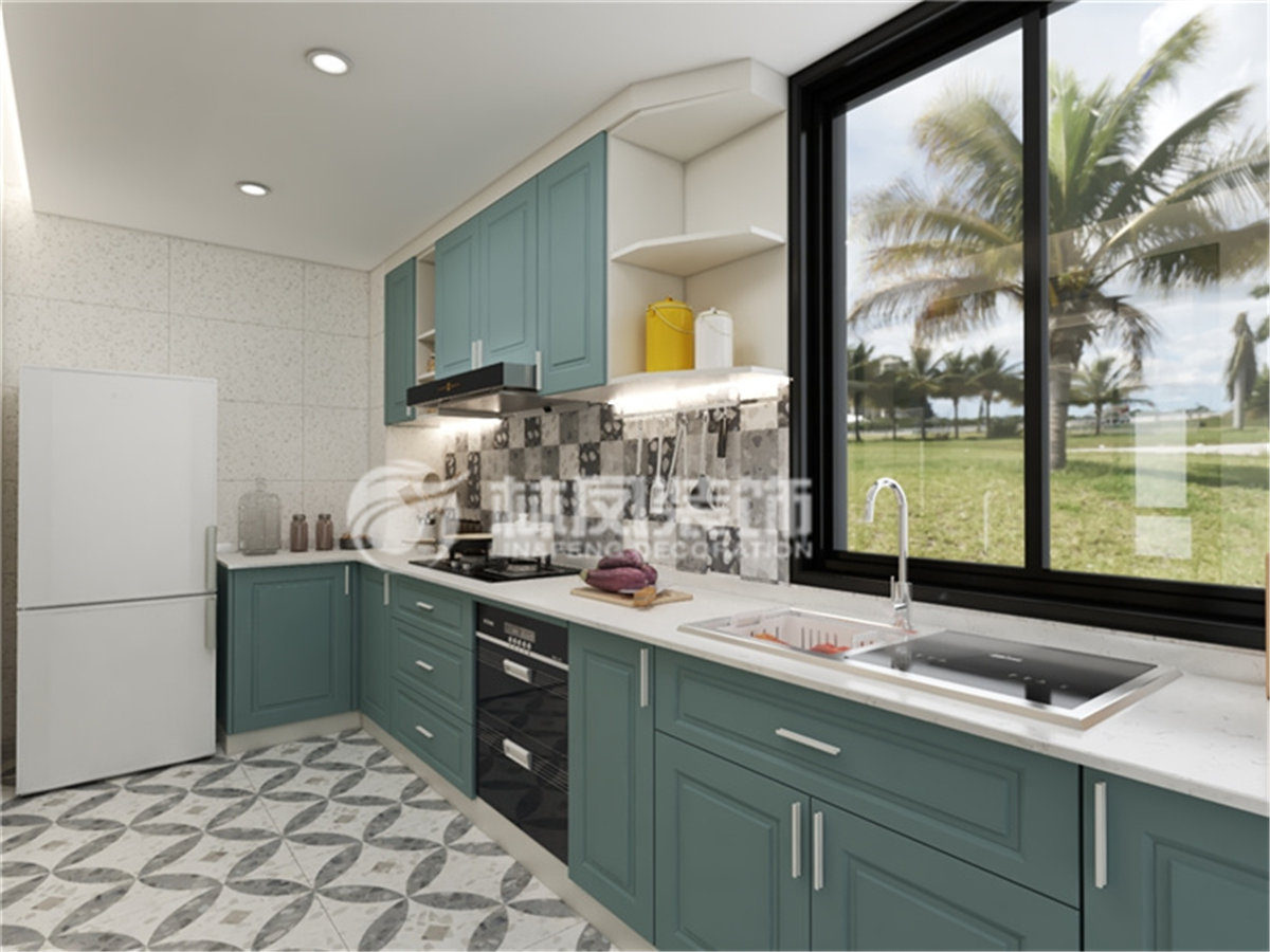 大胆使用重色调,巧妙利用空间,让卫生间实用高档且不显拥挤。 厨房:厨房整体色调以绿色白色为主,橱柜选用业界顶尖的品牌,质量无忧功能能强大,从设计感上来说简洁大气且不失美感与实用性。