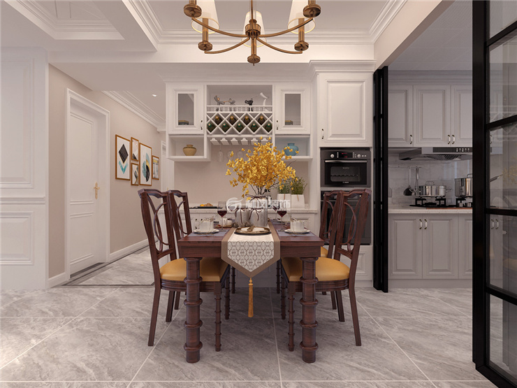 餐厅选择了具有传统美式特点的餐桌,侧面定制了储物以及展示功能强的酒柜,搭配的电器柜巧妙的融入了整体风格,嵌入式的蒸烤箱既满足了实用性也达到了美观性,餐吊与客厅吊灯样式相呼应烘托了气氛。