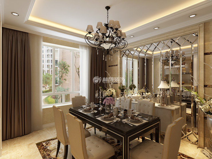 江户雅致200平3居室北欧风格林凤装饰的餐厅褐的餐桌与客厅的褐色茶几电视柜相互呼应,餐桌背景墙以理石和茶镜呈现,显示客户的年轻及时尚。
