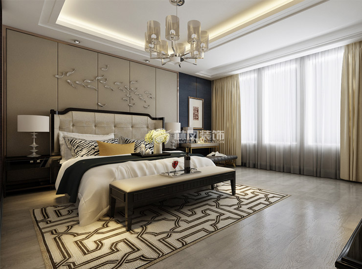 华润置地240平4居室港式风格林凤装饰的卧室以奇特的床型与大城市里猎奇的心态十分吻合,空间组合舒适,而不失审美情趣。