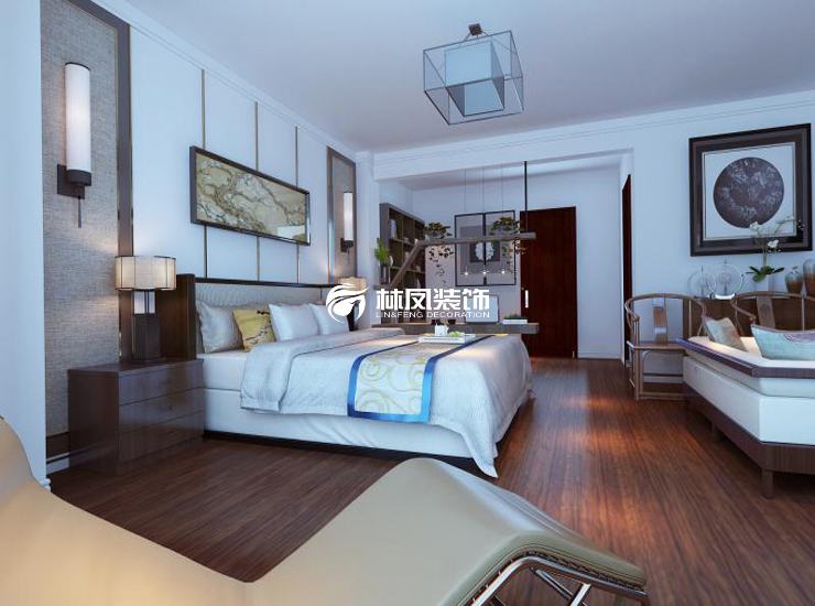 中铁梧桐苑200平二层洋房新中式风格林凤装饰的主卧空间教大,除了摆放床的位置,还为主卧放置书桌和书柜,给增加了客户阅读和学习的空间,在床对面放置电视,在床前还安置了中式沙发。在通过卫生间的过廊放置了衣帽间,极大的增加出纳空间,为客户合理的摆放衣物。