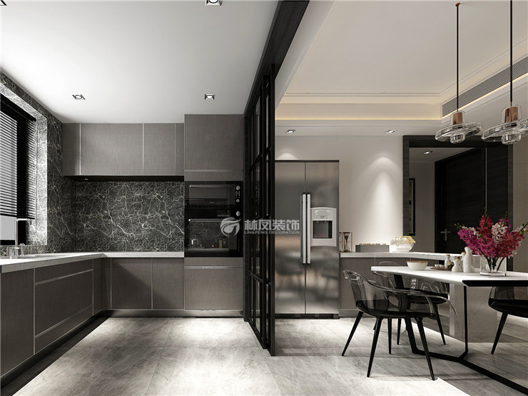华润24城130平2居室港式风格林凤装饰的餐厅是融入客厅内的,设计时候更倾向于餐厅实用功能,应业户要求做了早餐吧台,与居家装修的其他功能区也都形成了很好的搭配给予业主更多舒适与美好的生活感受。