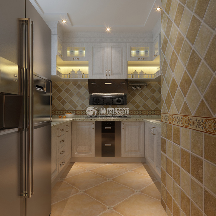美的庄园320平平别墅美式风格林凤装饰的厨房的空间布局上根据人体工程学设计的三角区,冰箱在一进厨房的左手边,菜盆在一进厨房的左手边,烟机在一进厨房的正对面,这样在我们从冰箱拿菜,在洗菜,切菜,炒菜上形成了流水线,让居住者使用上更加合理和方便。