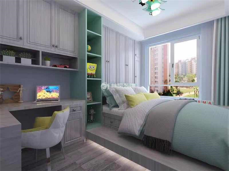 远洋大河宸章168平4居室现代简约风格林凤装饰的儿童房做的是榻榻米,榻榻米有很多收纳空间,白色柜体与绿色的隔断相互衬托,书桌方便孩子学习。