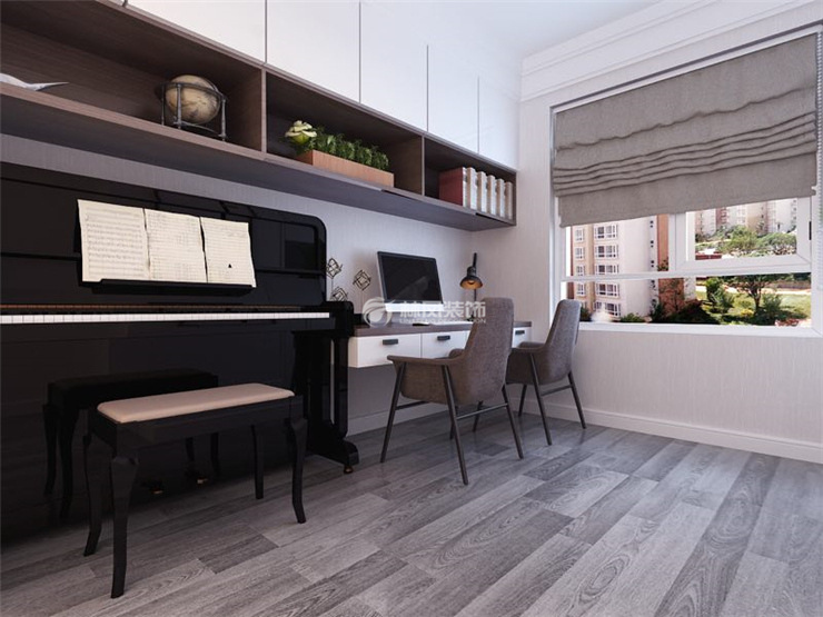 远洋大河宸章168平4居室现代简约风格林凤装饰的休闲区因为业主喜欢弹钢琴,所以在休息室摆放一个大钢琴在合适不过了,钢琴旁放置书桌方便业主预览书籍。
