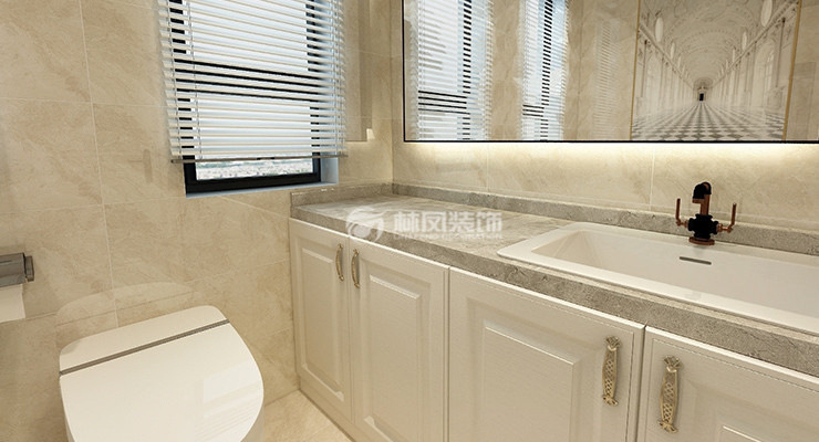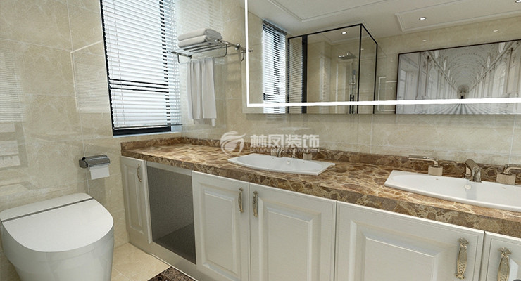 新希望紫檀山400平别墅新古典风格林凤装饰的卫生间选用浅色大理石墙砖提升卫生间整体的空间感,采用了双盆的洁具设计,使生活不再拥挤繁忙。让整个卫生间空间美观整洁实用。