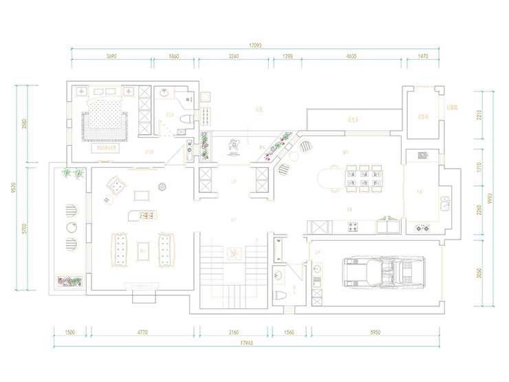 新希望紫檀山400平别墅新古典风格林凤装饰的餐厅区域整体较大,所以将西厨合并在一起。家具随着整体风格一齐,简单的白色搭配深木色,使整个空间统一协调。