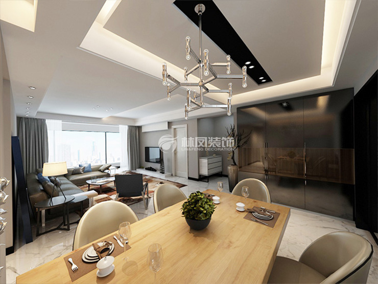中海国际社区185平4居室现代混搭风格林凤装饰以简洁明快的设计风格,全面考虑,主要以爵士白大理石为主色调,在地面,厨房等位置大量使用,优雅且端庄。吊顶的设计更是以简单且有创意的造型处理,区别于普通常见的边棚造型,几处个性的顶面造型增添了空间的层次感,更使灯光多元化。