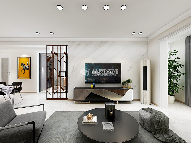 碧桂园御长白95平3居室现代简约风格林凤装饰的客厅主要以卡其色金色为主,家具选用灰色以及黑色进行搭配,空间内巧妙植入大胆亮彩色色,因业主两人对家的品质特别重视,希望回到家有个性的简约环境,所以这种搭配比较适合,并且在原户型的基础做了一些改动,扩大室内空间,对整体空间动线规划更是得到客户的极大认可。