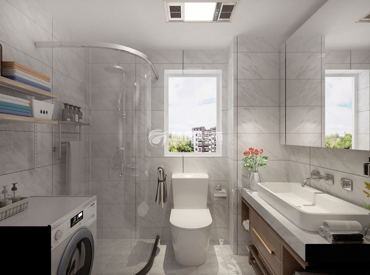 融创沈阳府145平4居室现代风格林凤装饰的卫生间考虑还是以实用为主,洋房的户型一般卫生间都带窗户,这样通风效果更好一些,选择砖的样式可深可浅空间够分明。洗手盆选择的是定制款,这样大大的增加了储物空间。