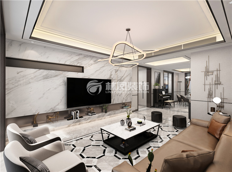越秀星汇云锦140平2居室港式风格林凤装饰的客厅所展现一个休闲的氛围,简单舒适,大理石电视背景墙的应用,又让空间不缺乏庄重感觉,爵士白大理石与整个空间又可以完美的结合。
