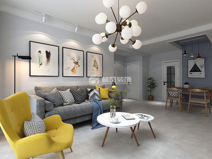 华强城105平2居室北欧风格林凤装饰的客厅由于楼层高度不太高,所以尽量采用地砖材质,增加屋内反光效果,增强屋内光线,大面积采用中性色系,家具和软装布艺采用原木和灰色系,给人干净明快的感觉,屋内的大多数家具和灯具的线条感相互呼应,立体感明朗。