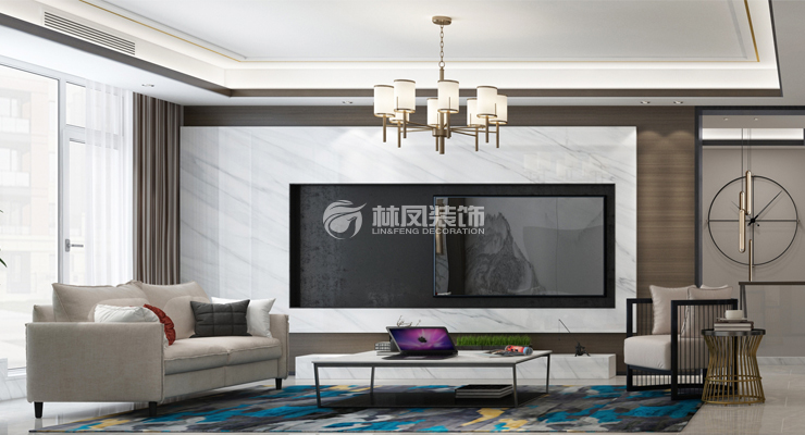 华润幸福里266平洋房新中式风格林凤装饰的客厅墙面以浅米色壁纸为基础,电视嵌入背景墙,背景墙采用大理石与木饰面的结合,黑色钢板嵌入大理石收边,使整体造型以及颜色对比更有层次,因为电视背景中点与沙发背景中点不在同一条直线上所以我们拉长了黑钢的嵌入长度,电视向北移,电视中点与沙发中点在一条直线上。电视机本身的颜色与黑色钢板相互融合,在视觉上解决了不对中的问题。沙发背景为新中式最常见的设计手法,对称法,中间定制的带有万重山的理石背景墙,非常大气。“前有流水,背有靠山”。