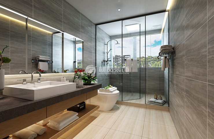 华润昆仑御府127平3居室港式风格林凤装饰的卫生间一字型的摆放布局 使得空间整体布局非常协调 定制的台上手盆 体现了业主的个性 不喜欢中规中矩 的台下手盆 。