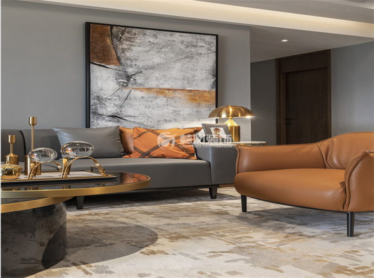 金地檀府180平四室两厅现代风格林凤装饰的客厅以灰色的沙发增加了跳色的点缀,略显高档,看起来明亮简洁,简约又舒适,打开一盏灯,光晕和冷峻的空间撞出一种宁静的力量。在简洁中寻找其暗藏的美感,增强了内部层次感,简洁而不简单的变化,充分的体现出了“简单,温馨,实在”的风格。