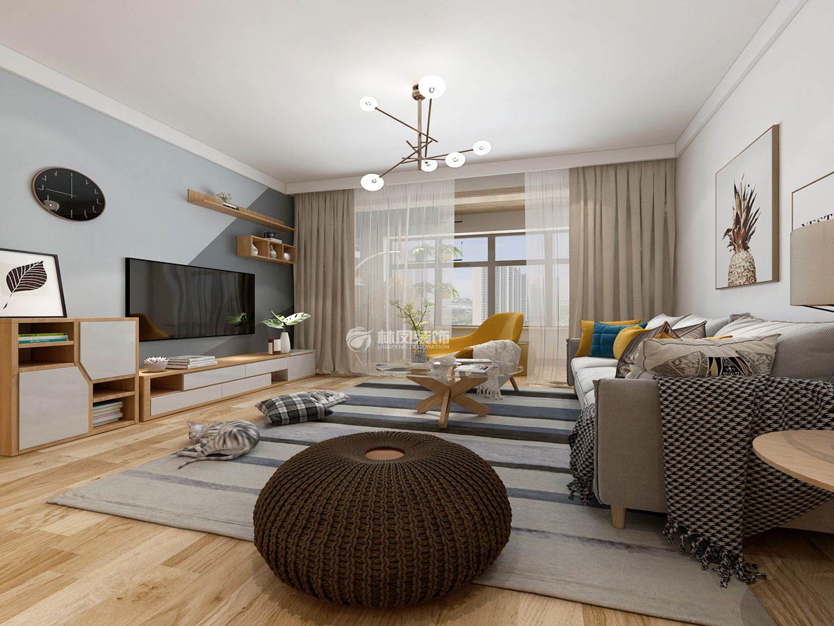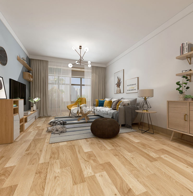 远洋大河宸章89m²两室两厅北欧风格林凤装饰的客厅以原木为主,北欧元素为辅,家具材质采用现代家具,增加家里现代的感觉,棚面与墙面都做了比较简单的造型,墙面采用了新颖蓝灰色色彩拼块护壁纸,让整体空间显得不那么发黄,让整个客厅空间大气稳重,又略显时尚。