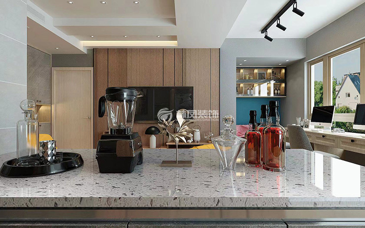 乐天圣苑122平三室两厅现代极简风格林凤装饰的厨房是开放式的,沙发后面设计了倒台,空间感更加的宽敞明亮,灰色的橱柜门与原木色的上柜形成鲜明的对比,增加空间立体感。