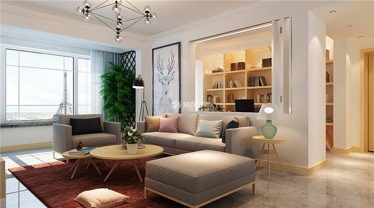 首创光和城135平四室两厅北欧风格林凤装饰的客厅与书房墙面打通,布局没有改变,但是一米以上视野开阔,两个固定的空间变成了两个互通的空间,交流感很好。因为很少看电视,所以采用电动幕布设计,平时是卷到棚面的。