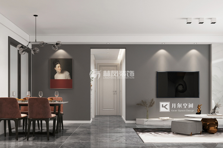 龙湖西府原著125平三室两厅现代风格林凤装饰的客厅电视背景与餐厅背景做了一致的高级灰色处理,电视背景的爵士白大理石造型与灰掉背景形成对比,让整体颜色更有层次感。