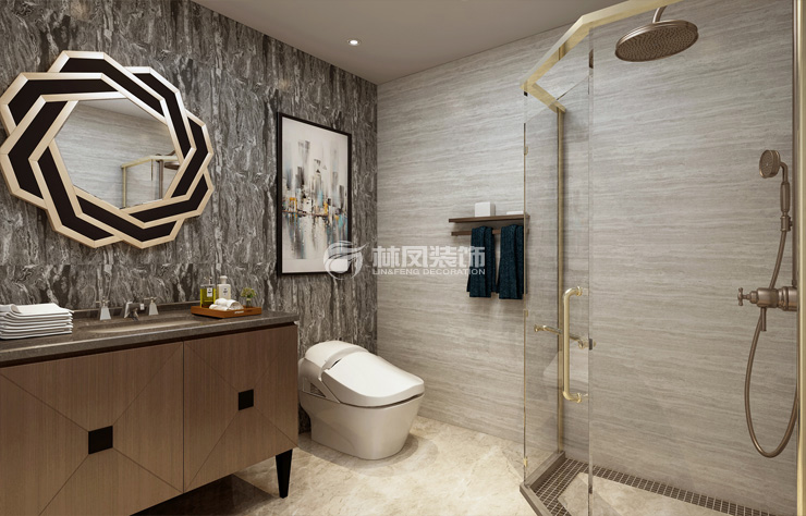 三室两厅一厨两卫,高层整体采用美式风格,色调以深色为主,体现美式的居家感和温馨感。