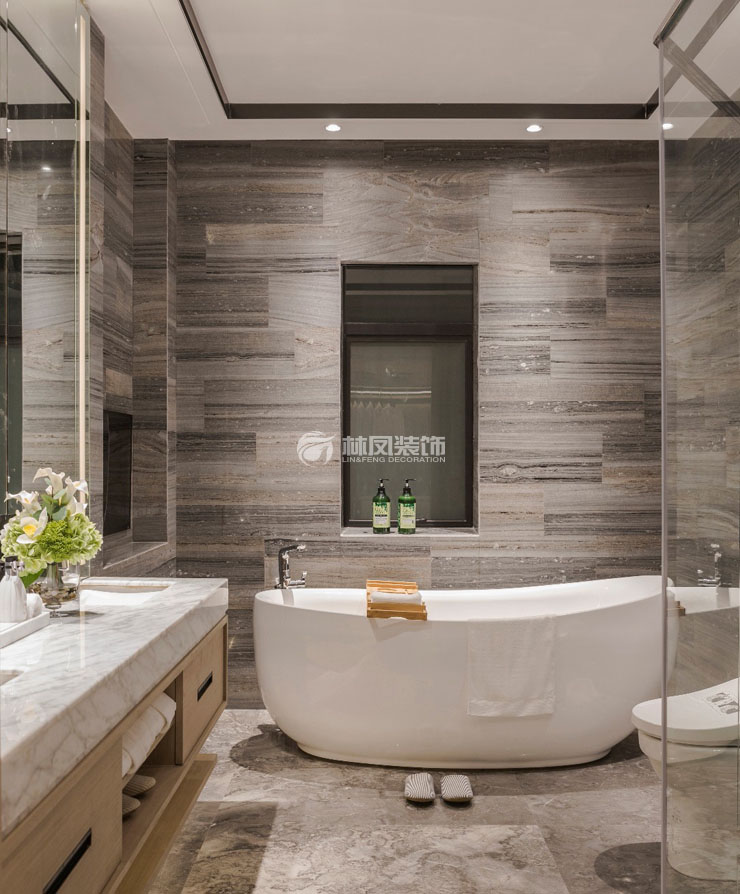 万科翡翠200平别墅新中式风格林凤装饰的卫生间采用灰色大理石瓷砖上墙与卧室的地毯文理保持一致,也使不同空间的以延伸,木色质感卫浴,显得卫生间更简单大气,也从整体色彩上与装饰风格形成了简单的呼应。
