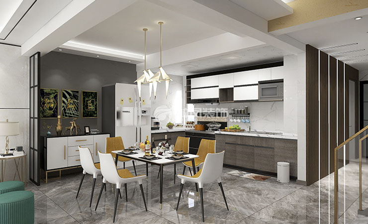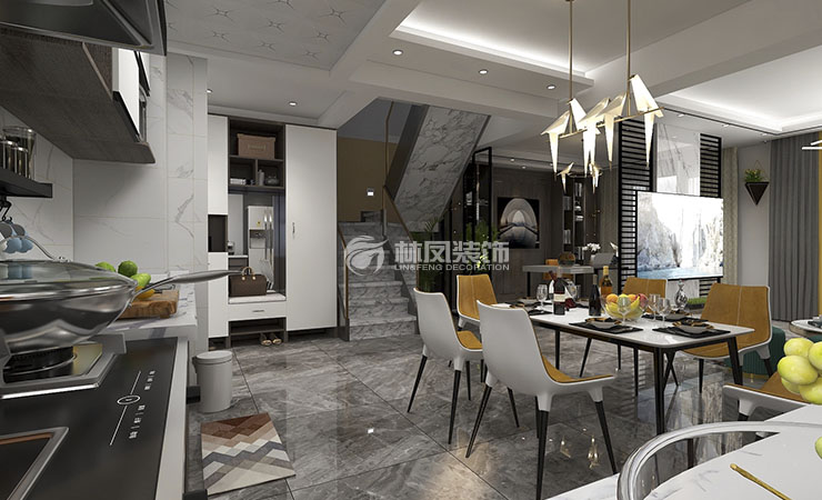 旭辉璟宸府200平三室两厅现代风格林凤装饰的厨房打通,与客厅合二为一,开放式厨房解放了一层的大部分面积,让简单,宽敞成为了本案的代名词。