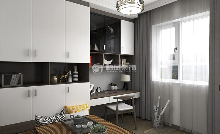 旭辉璟宸府200平三室两厅现代风格林凤装饰的书房以简洁轻奢的书柜,金属框架的挂画配合简易的书桌,和整体装修风格相辅相成。现代感超强的壁灯,夜间读书办公更显气质。