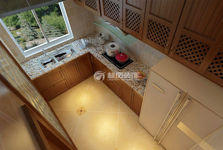 厨房选用了L字型的设计及方便了活动空间又满足了日常功能性的需求,橱柜选择原木色的门板作为装饰也给简洁的厨房增加了亮点,墙砖选择了偏田园风的仿古砖和暖色系地砖呼应,使整体风格上倾向于简约美式风格。
