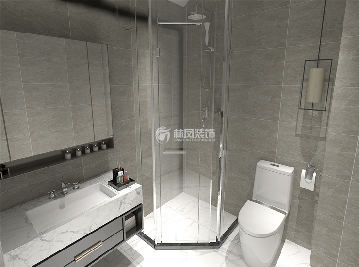 融创中央学府140平三室两厅美式风格林凤装饰的卫生间采用干湿分离得设计,外部分就是手盆及洗衣机,特别定制得花片,穿插在其中,让整个干区也成为过厅得亮点。